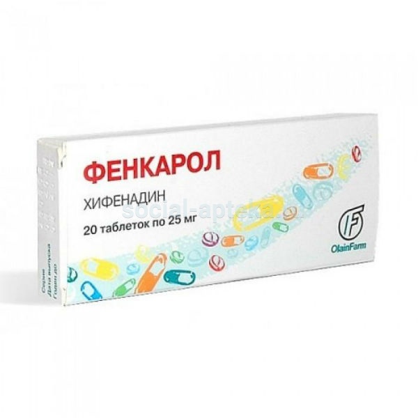Фенкарол - антиэкссудативное, противозудное, противоаллергическое, противоотечное.ФармакодинамикаДействующее вещество препарата хифенадин — блокатор H1-гистаминовых рецепторов, — предупреждает развитие и облегчает течение аллергических реакций. Оказывает противоаллергическое, антиэкссудативное и противозудное действие, предотвращая развитие аллергического воспаления в ткани. Ослабляет действие гистамина, уменьшает его влияние на проницаемость сосудов (снижая проницаемость, оказывает противоотечный эффект), снижает его бронхоспастическое действие и спазмогенное влияние на гладкую мускулатуру кишечника, ослабляет гипотензивное действие гистамина. Хифенадин уменьшает содержание гистамина в тканях (связано со способностью активировать диаминоксидазу — фермент, инактивирующий гистамин). При курсовом лечении антигистаминное действие хифенадина не снижается. Обладает умеренным антисеротониновым действием, проявляет слабую м-холиноблокирующую активность. Не оказывает угнетающее влияние на ЦНС.Фармакокинетика45% хифенадина быстро абсорбируется из ЖКТ и уже через 30 мин обнаруживается в тканях организма. Cmaxактивного вещества в плазме крови достигается через 1 ч. Обладает низкой липофильностью, плохо проникает через ГЭБ. Самое высокое содержание активного вещества отмечено в печени, несколько меньшее в легких и почках, самое низкое — в головном мозге (меньше 0,05%, что объясняет отсутствие угнетающего влияния наЦНС). Хифенадин метаболизируется в печени. Метаболиты выводятся почками и кишечником. Из кишечника выводится неабсорбированная часть препарата.