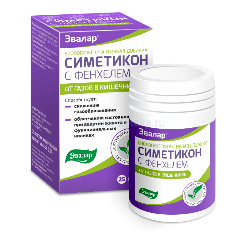 Плоды фенхеля обладают спазмолитическим, противорвотным действиями, усиливают секрецию желудка, кишечника, возбуждают аппетит, улучшают пищеварение, освобождают желудок и кишечник от газов, уменьшают и прекращают желудочно-кишечные колики2. Симетикон снижает поверхностное натяжение на границе раздела фаз, вследствие чего затрудняет образование и способствует разрушению газовых пузырьков в содержимом кишечника и слизи желудочно-кишечного тракта. Высвобождающиеся при этом газы всасываются стенкой кишечника или удаляются благодаря перистальтике, что предупреждает образование больших газово-слизистых конгломератов, вызывающих болезненное вздутие живота. Симетикон удаляет пену физическим путем, не вступая в химические реакции.Вещество не всасывается из желудочно-кишечного тракта и не влияет на процесс пищеварения. Вследствие физической и химической инертности он не влияет на микроорганизмы и ферменты, присутствующие в желудочно-кишечном тракте, не уменьшает всасывание пищи, не изменяет реакцию и объем желудочного сока. После прохождения желудочно-кишечного тракта выводится в неизмененном виде, что уменьшает вероятность развития побочных эффектов