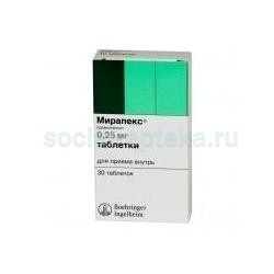 Мирапекс - дофаминергическое, противопаркинсоническое.ФармакодинамикаПрамипексол — агонист дофаминовых рецепторов, с высокой селективностью и специфичностью связывается с дофаминовыми рецепторами подгруппы D2, из которых обладает наиболее выраженным сродством к D3-рецепторам. Уменьшает дефицит двигательной активности при болезни Паркинсона за счет стимулирования дофаминовых рецепторов в полосатом теле. Прамипексол ингибирует синтез, высвобождение и метаболизм дофамина. Прамипексол in vitroзащищает дофаминовые нейроны от дегенерации, возникающей в ответ на ишемию или метамфетаминовую нейротоксичность.Точный механизм действия препарата при лечении синдрома беспокойных ног в настоящее время не известен. Несмотря на то, что патофизиология синдрома беспокойных ног до конца не изучена, имеются нейрофармакологические сведения о первичном вовлечении в процесс дофаминергической системы. Исследования, выполненные с использованием позитронно-эмиссионной томографии (ПЭТ), показали, что в патогенез синдрома беспокойных ног может быть вовлечена умеренная пресинаптическая дофаминергическая дисфункция в полосатом теле.Прамипексол in vitro защищает нейроны от нейротоксичности леводопы.Снижает секрецию пролактина (дозозависимо).При длительном применении (более 3 лет) прамипексола у пациентов с болезнью Паркинсона, признаков снижения эффективности не было.При применении прамипексола у пациентов с синдромом беспокойных ног в течение 1 года, эффективность препарата сохранялась.ФармакокинетикаПрамипексол после приема внутрь быстро и полностью всасывается. Абсолютная биодоступность составляет более 90%, и Cmax в плазме наблюдается через 1–3 ч. Скорость всасывания снижается при приеме пищи, однако на общий объем всасывания прием пищи не влияет. Для прамипексола характерна линейная кинетика и относительно небольшая вариабельность концентраций между пациентами.Прамипексол связывается с белками в очень незначительной степени (d(400 л). Подвергается метаболизму в незначительной степени. Около 90% дозы выводится через почки (80% — в неизмененном виде) и менее 2% обнаруживается в кале. Общий клиренс прамипексола составляет около 500 мл/мин, почечный клиренс составляет около 400 мл/мин.T1/2 колеблется от 8 ч у молодых и до 12 ч у пожилых людей.