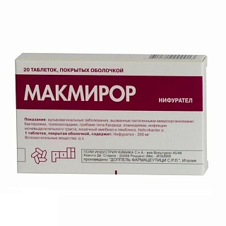 Макмирор - противомикробное, противопротозойное, противогрибковое.ФармакодинамикаНифурател, противомикробное средство из группы нитрофуранов; оказывает противопротозойное, противогрибковое и антибактериальное действие.Нифурател обладает высокой эффективностью и низкой токсичностью, что обуcловливает широкий спектр его клинического применения.Высокоэффективен в отношении Papiliobacter и Helicobacter pylori, грамположительных и грамотрицательных микроорганизмов: при минимальной подавляющей концентрации (МПК) 12,5 –25 мкг/мл подавляет от 44,3 до 93,2% культур.Проявляет высокую активность как в отношении аэробных, так и в отношении анаэробных возбудителей.Спектр действия включает: Enterococcus faecalis, Enterococcus faecium, Staphylococcus aureus, Bacillus subtilis, Escherichia coli, Shigella flexneri 2a, Shigella flexneri 6, Shigella sonnei, Salmonella typhi, Salmonella typhimurium, Salmonella enteritidis, Klebsiella spp., Enterobacter sph., Serratia spp., Citrobacter spp., Morganella spp., Rettgerella spp., Pragia fontium, Budvicia aquatica, Rachnella aquatilis и Acinetobacter spp., прочие атипичные энтеробактерии, а также простейшие (амебы, лямблии); менее активен в отношении Proteus mirabilis, Proteus vulgaris, Pseudomonas aeruginosa.Является препаратом выбора для терапии сальмонеллезов, шигеллезов и др. кишечных бактериальных инфекций.Активен в отношении Trichomonas vaginalis, высокоактивен в отношении грибов рода Candida.Особенно эффективен в отношении штаммов Helicobacter pylori, устойчивых к метронидазолу.Получены данные, свидетельствующие о высокой активности нифуратела (in vitro и in vivo) в отношении Atopobium vaginae — основного маркера бактериального вагиноза.ФармакокинетикаПри приеме внутрь быстро абсорбируется из ЖКТ. Проникает через ГЭБ и гематоплацентарный барьер, выделяется с грудным молоком. Метаболизируется в печени и мышечной ткани. Полностью выводится из организма почками (30–50% — в неизмененном виде), оказывая сильное антибактериальное действие в мочевыводящем тракте.