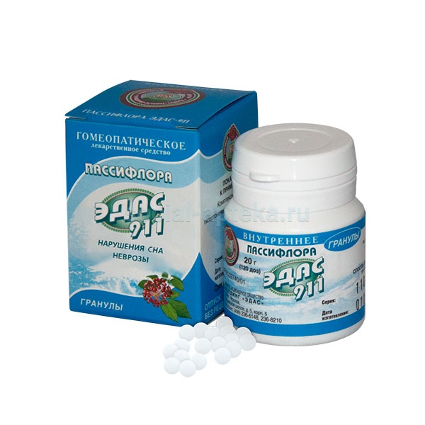 Если не назначено иначе, Пассифлора ЭДАС-911 принимать внутрь вне приема пищи по 5 гранул под язык до полного растворения 3 раза в сутки.