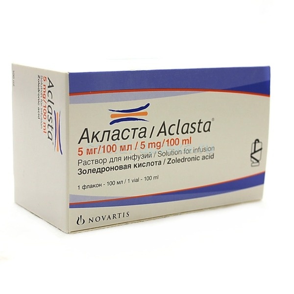 Лечение различных видов остеопороза, костной болезни Педжета и профилактика новых переломов у мужчин и женщин с переломами проксимального отдела бедренной кости. При в/в введении 5 мг препарата Акласта 1 раз в год для лечения постменопаузного остеопороза у женщин, остеопороза у мужчин, для профилактики новых переломов у мужчин и женщин с переломами проксимального отдела бедренной кости, для профилактики и лечения остеопороза, вызванного применением ГКС и для лечения костной болезни Педжета большинство нежелательных явлений (НЯ) были слабо или умеренно выраженными. После в/в введения препарата Акласта у данных больных наиболее часто наблюдались следующие НЯ: длительностью обычно не более 3 дней («постдозные» симптомы) — лихорадка (18,1%), миалгии (9,4%), гриппоподобный синдром (7,8%), артралгии (6,8%), головная боль (6,5%). Большинство вышеназванных НЯ, отмечавшихся в течение 3 дней после введения препарата, были слабо или умеренно выраженными. При повторном введении препарата выраженность данных НЯ значительно уменьшалась. Ниже представлены НЯ, возможно связанные (по мнению лечащих врачей) с применением препарата для лечении различных видов остеопороза, костной болезни Педжета и для профилактики новых переломов у мужчин и женщин с переломами проксимального отдела бедренной кости.Со стороны нервной системы: часто — головная боль, головокружение; иногда — заторможенность*, парестезия, сонливость, тремор, обморок.Со стороны органов чувств: иногда — конъюнктивит, боль в глазах, вертиго; редко — увеит*, эписклерит, ирит.Со стороны дыхательной системы: иногда — одышка*, кашель.Со стороны пищеварительной системы: часто — тошнота, рвота, диарея; иногда — анорексия*, снижение аппетита, диспепсия*, боль в животе*, сухость во рту, эзофагит*, гастроэзофагеальный рефлюкс, боль в верхних отделах живота, запоры.Со стороны кожи и подкожной клетчатки: иногда — сыпь, гипергидроз*, зуд, эритема.Со стороны скелетно-мышечной системы и соединительной ткани: часто — артралгии*, миалгии*; боли в костях, боли в спине и конечностях; иногда — боль в области шеи, отек в области суставов*, мышечные спазмы, боль в области плечевого пояса, боль в области грудной клетки* мышечно-скелетного происхождения, слабость в мышцах, скованность в мышцах* и суставах*, артриты, мышечно-скелетные боли.Со стороны мочевыделительной системы: иногда — повышение уровня креатинина крови, поллакиурия, протеинурия.Со стороны системы кроветворения: иногда — анемия.Со стороны сердечно-сосудистой системы: иногда — повышение АД, внезапное покраснение лица.Инфекции и инвазии: иногда — грипп, назофарингит.Со стороны организма в целом: очень часто — повышение температуры; часто — гриппоподобный синдром, озноб, повышенная утомляемость*, астения, боль*, общее недомогание; нечасто — периферические отеки, чувство жажды*, повышенная возбудимость*, боль в груди (не связанная с заболеваниями сердца).*Примечание: в отдельных исследованиях частота данных НЯ увеличивалась следующим образом: очень часто — миалгии, артралгии, повышенная утомляемость, боль; часто — заторможенность, одышка, диспепсия, эзофагит, боль в животе, гипергидроз, скованность в мышцах, отек в области суставов, боль в области грудной клетки мышечно-скелетного происхождения, скованность в суставах, анорексия, чувство жажды, повыш