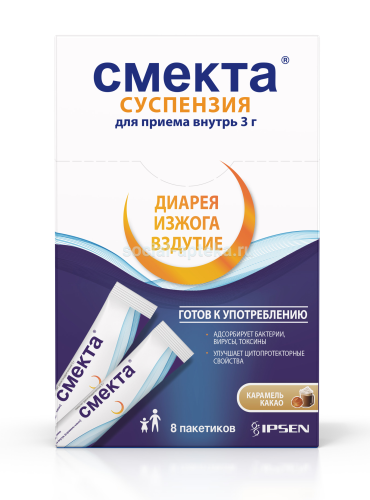 На 1 пакетик: Действующее вещество: смектит диоктаэдрический - 3,00 г Вспомогательные вещества: ароматизатор карамель-какао1 - 0,10 г, ксантановая камедь - 0,03 г, лимонная кислота моногидрат - 0,02 г, аскорбиновая кислота- 0,01 г, калия сорбат - 0,01 г, сукралоза - 0,00375 г, вода очищенная до 10,00 г 1 Ароматизатор карамель-какао состоит из натуральных ароматизаторов (2,7%), вкусоароматическиих веществ (1,0%), натуральных вкусоароматических веществ (0,3%), кофеина (0,04%), красителя "карамель" E150d (0,06%) карамелизированного сахарного сиропа (49,8%), пропиленгликоля Е1520 (22,4 %), этанола (8,6%), воды (15,0%).