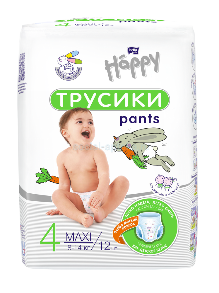 Трусики bella baby Happy размера maxi (4) для малышей весом 8-14 кг! Подгузники трусики отличное впитывают и не протекают. Специальный нетканый материал ускоряет распределение влаги по всей поверхности трусиков и обеспечивает чувство сухости. «Дышащий» внешний слой трусиков обеспечивает доступ воздуха к коже ребенка. Отличительная особенность подгузников-трусиков Happy – особо мягкий и эластичный поясок. Разработанные для очень простого надевания и снятия трусики помогают перейти к следующему этапу развития ребенка – приучения к горшку.