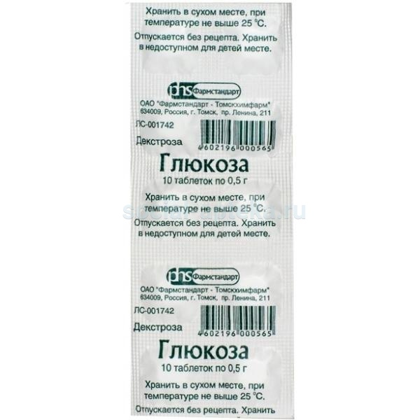 Препарат выпускается в форме таблеток и раствора для внутривенного введения. Основным действующим веществом Глюкозы является декстрозы моногидрат, его содержание составляет в: Одной таблетке – 500 мг; 100 мл раствора – 40, 20, 10 и 5 г. В состав вспомогательных компонентов раствора входит вода для инъекций и хлористоводородная кислота. В аптечную сеть препарат поступает: Таблетки – в контурных ячейковых упаковках по 10 штук; Раствор для инфузий – в пластиковых контейнерах по 50, 100, 150, 250, 500, 1000 мл или в стеклянных бутылках по 100, 200, 400, 500 мл; Раствор для внутривенного введения – в стеклянных ампулах по 5 мл и 10 мл.