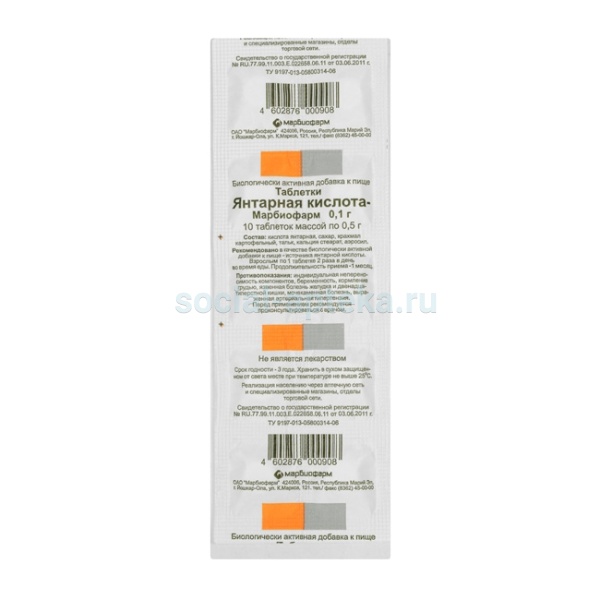 1 таблетка содержит: действующее вещество: кислота янтарная 100 мг. вспомогательные вещества: сахар, крахмал картофельный, тальк, кальция стеарат, аэросил