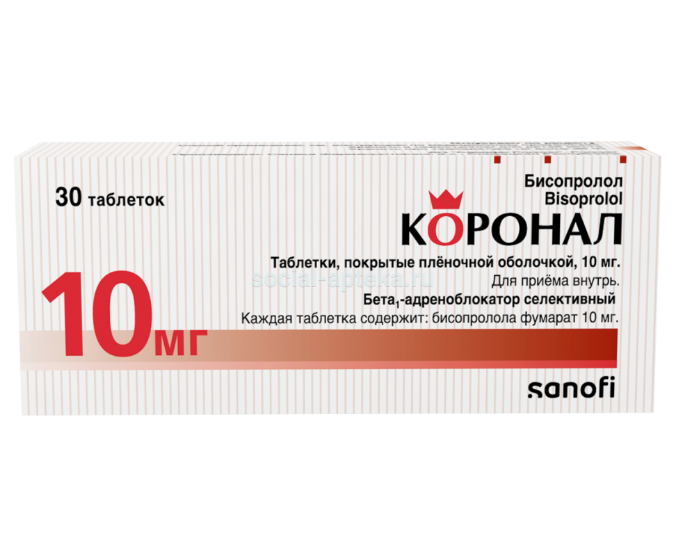 Аллергены, используемые для иммунотерапии, или экстракты аллергенов для кожных проб повышают риск возникновения тяжелых системных аллергических реакций или анафилаксии у больных, получающих бисопролол.При одновременном применении с Короналом йодосодержащие рентгеноконтрастные лекарственные средства для в/в введения повышают риск развития анафилактических реакций.При одновременном применении с Короналом фенитоин для в/в введения, лекарственные средства для ингаляционной общей анестезии (производные углеводородов) повышают выраженность кардиодепрессивного действия и вероятность снижения АД.При одновременном применении Коронал изменяет эффективность инсулина и пероральных гипогликемических лекарственных средств, маскирует симптомы развивающейся гипогликемии ( тахикардию, повышение АД).При одновременном применении Коронал снижает клиренс лидокаина и ксантинов (кроме дифиллина) и повышает их концентрацию в плазме, особенно у больных с исходно повышенным клиренсом теофиллина под влиянием курения.НПВС (за счет задержки ионов натрия и блокады синтеза простагландина почками), ГКС и эстрогены (за счет задержки ионов натрия) ослабляют гипотензивный эффект Коронала.При одновременном применении с Короналом сердечные гликозиды, метилдопа, резерпин и гуанфацин, блокаторы медленных кальциевых каналов ( верапамил, дилтиазем ), амиодарон и другие антиаритмические лекарственные средства повышают риск развития или усугубления брадикардии, AV-блокады, остановки сердца и сердечной недостаточности.При одновременном применении с Короналом нифедипин может приводить к значительному снижению АД.При одновременном применении с Короналом диуретики, клонидин, симпатолитики, гидралазин и другие гипотензивные лекарственные средства могут привести к чрезмерному снижению АД.Коронал удлиняет действие недеполяризующих миорелаксантов и антикоагулянтный эффект кумаринов.При одновременном применении с Короналом трициклические и тетрациклические антидепрессанты, антипсихотические лекарственные средства (нейролептики), этанол, седативные и снотворные лекарственные средства усиливают угнетение ЦНС.Не рекомендуется одновременное применение Коронала с ингибиторами МАО вследствие значительного усиления гипотензивного действия, перерыв в лечении между приемом ингибиторов МАО и Коронала должен составлять не менее 14 дней.При одновременном применении с Короналом негидрированные алкалоиды спорыньи, эрготамин повышают риск развития нарушений периферического кровообращения.При одновременном применении с Короналом сульфасалазин повышает концентрацию бисопролола в плазме.При одновременном применении с Короналом рифампицин укорачивает период полувыведения бисопролола.