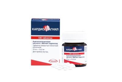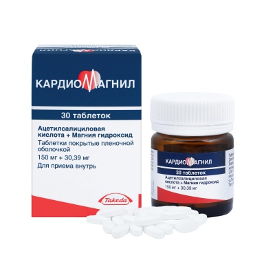 Фармгруппа: анальгезирующее средство (НПВП+антацидное средство). Фармдействие: Кардиомагнил - комбинированный препарат, действие которого обусловлено входящими в его состав компонентами. НПВС, антиагрегант. В основе механизма действия ацетилсалициловой кислоты лежит необратимое ингибирование фермента ЦОГ-1, в результате чего блокируется синтез тромбоксана А2 и подавляется агрегация тромбоцитов. Считают, что ацетилсалициловая кислота имеет и другие механизмы подавления агрегации тромбоцитов, что расширяет область ее применения при различных сосудистых заболеваниях. Ацетилсалициловая кислота обладает также противовоспалительным, анальгезирующим и жаропонижающим действием. Магния гидроксид, входящий в состав Кардиомагнила, защищает слизистую оболочку ЖКТ от воздействия ацетилсалициловой кислоты.