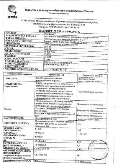 Фармгруппа: антибиотик-цефалоспорин. Фармдействие: Клафоран - полусинтетический антибиотик группы цефалоспоринов III генерации для парентерального применения. Цефотаксим действует бактерицидно. Он также устойчив к действию большинства B-лактамаз. К препарату обычно чувствительны: Aeromonas hydrophila; Bacillus subtilis; Bordetella pertussis; Borrelia burgdorferi; Moraxella (Branhamella) catarrhalis; Citrobacter diversus; Clostridium perfringens; Corynebacterium diphtheriae; Escherichia coli; Enterobacter spp. (чувствительность зависит от данных эпидемиологии и от уровня устойчивости в каждой конкретной стране); Erysipelothrix insidiosa; Eubacterium; Haemophilus пенициллиназообразующие и непенициллиназообразующие штаммы, включая ampi-R; Klebsiella pneumoniae; Klebsiella oxytoca; Methi-S-Staphylococcus, включая пенициллиназообразующие и непенициллиназообразующие штаммы; Morganella morganii; Neisseria gonorrhoeae, включая пенициллиназообразующие и непенициллиназообразующие штаммы; Neisseria meningitidis; Propionibacterium; Proteus mirabilis, vulgaris; Providencia; Streptococcus pneumoniae, Salmonella; Seratia spp. (чувствительность зависит от данных эпидемиологии и от уровня устойчивости в каждой конкретной стране); Shigella, Streptococcus spp.; Veillonella; Yersinia (чувствительность зависит от данных эпидемиологии и от уровня устойчивости в каждой конкретной стране). К препарату Клафоран устойчивы: Acinetobacter baumannii, Bacteroides fragilis; Clostridium difficile; Enterococcus; грамотрицательные анаэробы; Listeria monocytogenes, Methi-R staphylococcus; Pseudomonas aeruginosa, Pseudomonas cepacia; Stenotrophomonas maltophilia. Фармакокинетика: У взрослых — через 5 минут после однократного в/в введения 1 г цефотаксима концентрация в плазме крови составляет 100 мкг/мл. После в/м введения цефотаксима в той же дозе максимальная концентрация в плазме крови обнаруживается через 0,5 часа и составляет от 20 до 30 мкг/мл. T1/2 препарата Клафоран составляет 1 ч при в/в введении и 1–1,5 ч при в/м введении. Связывание с белками плазмы (преимущественно альбуминами) составляет в среднем 25–40%. Около 90% от введенной дозы выводится с мочой: 50% — в неизмененном виде и около 20% — в виде метаболита дезацетилцефотаксима. У пожилых (старше 80 лет) Т1/2 цефотаксима увеличивается до 2,5 ч. У взрослых с нарушенной функцией почек — объем распределения не изменяется, а Т1/2 не превышает 2,5 ч, даже на последних стадиях почечной недостаточности. У детей, новорожденных и преждевременно родившихся младенцев уровень цефотаксима в плазме и объем распределения аналогичны таковым у взрослых, получающих такую же дозу препарата в мг/кг. Т1/2 цефотаксима составляет от 0,75 до 1,5 ч. У новорожденных и преждевременно родившихся детей уровень цефотаксима в плазме и объем распределения аналогичны таковым у детей. Средний Т1/2 цефотаксима составляет от 1,4 до 6,4 ч.