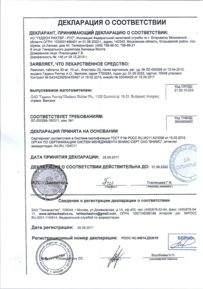 Противосудорожный (противоэпилептический) препарат. Стабилизирует потенциал-зависимые натриевые каналы клеточных мембран. Так же блокирует высвобождение нейротрансмиттеров, в основном глутаминовой аминокислоты (играющей ключевую роль в развитии эпилептических припадков).Фармакокинетика ВсасываниеПосле приема внутрь быстро и полностью абсорбируется из кишечника, существенно не подвергается эффекту "первого прохождения". Cmax достигается через 2.5 ч после приема внутрь. Прием пищи замедляет процесс всасывания, но не влияет на его эффективность. Биодоступность - 98%. Фармакокинетика препарата после однократного приема в дозе, не превышающей 450 мг, имеет линейный характер. Концентрация в равновесном состоянии носит резко выраженный индивидуальный характер.РаспределениеСвязывание с белками составляет 55%. Маловероятно, что вытеснение ламотриджина из связи с белками может вызвать токсический эффект. Vdсоставляет 0.92-1.22 л/кг массы тела. Выделяется с грудным молоком. Концентрация в грудном молоке составляет 40-60% от плазменной концентрации. В некоторых случаях концентрация препарата в сыворотке крови грудных детей, матери которых принимали препарат в период кормления грудью, достигает терапевтического уровня.МетаболизмБиотрансформируется в печени под действием глюкуронил-трансферазе уридин-дифосфата. Среди метаболитов преобладают N -глюкурониды. Ламотриджин в умеренной степени и дозозависимо индуцирует собственный метаболизм.ВыведениеСредний клиренс в равновесном состоянии у здоровых взрослых составляет 39±14 мл/мин. Выводится вместе с мочой в форме конъюгата глюкуронида, менее 10% - в неизмененном виде, около 2% (в неизмененном виде и виде метаболитов) - с калом. Клиренс и T1/2 не зависят от дозы.T1/2 здоровых добровольцев составляет 24-35 ч.Фармакокинетика в особых клинических случаяхКлиренс, пересчитанный на кг массы тела, у детей выше, чем у взрослых, и наиболее высок до 5-летнего возраста. T1/2 у детей обычно короче, чем у взрослых.T1/2 у детей при одновременном применении с индукторами ферментов составляет 7 ч, с вальпроатом натрия - 45-60 ч.Клиренс ламотриджина у лиц пожилого возраста и более молодых пациентов минимально отличаются друг от друга.