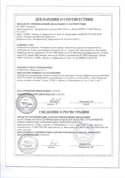 Непосредственно перед использованием одной из вакцин вампулу с препаратом вносят растворитель из расчета 0,5 мл на одну прививочнуюдозу вакцины.