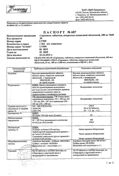 1 таблетка, покрытая оболочкой, содержит: действующее вещество: кветиапин (в виде фумарата) 100 мг, вспомогательные вещества: повидон; дигидрат двухосновного фосфата кальция; МКЦ; крахмал (гликолят натрия); лактозы моногидрат; магния стеарат состав оболочки: железа оксид красный (таблетки по 25 мг); железа оксид желтый (таблетки по 25 и 100 мг); титана диоксид; гидроксипропилметилцеллюлоза; полиэтиленгликоль 400
