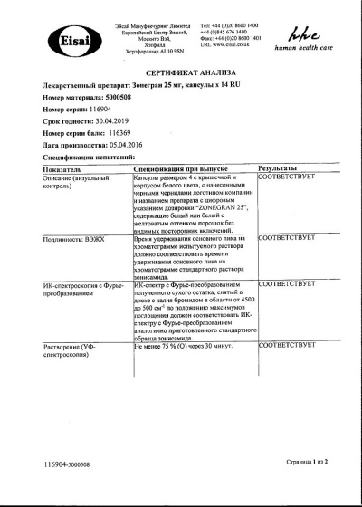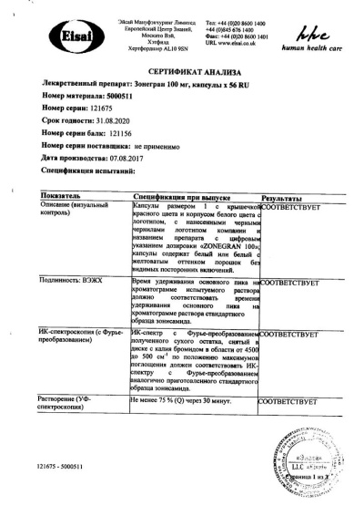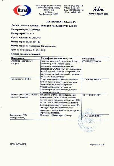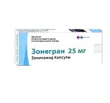 Зонегран - противоэпилептическое.ФармакодинамикаЗонисамид является противоэпилептическим средством, производным бензизоксазола, in vitroслабо угнетает карбоангидразу. Химически его структура отличается от других противоэпилептических средств.Механизм действияМеханизм действия зонисамида полностью не изучен, вероятно, он блокирует потенциалчувствительные натриевые и кальциевые каналы, снижает выраженность синхронизированного нейронного возбуждения, тормозит развитие приступов и предотвращает дальнейшее распространение эпилептической активности. Зонисамид также снижает судорожную активность нейронов посредством усиления тормозного влияния ГАМК.Фармакодинамические эффектыПротивосудорожная активность зонисамида была изучена на различных моделях эпилепсии, в группах с индуцированными или врожденными приступами, при этом зонисамид проявил себя как противоэпилептическое средство широкого спектра действия. Зонисамид препятствует развитию максимальных электросудорожных приступов, ограничивает развитие судорог, включая распространение очага возбуждения от коры головного мозга до подкорковых структур, а также подавляет активность эпилептогенного фокуса. В отличие от фенитоина и карбамазепина, зонисамид обладает избирательным действием на приступы, возникающие в коре головного мозга.Клиническая эффективностьМонотерапия парциальных судорожных приступов с вторичной генерализацией или без.Эффективность зонисамида в режиме монотерапии у пациентов с впервые диагностированными парциальными эпилептическими приступами с вторичной генерализацией или без, с генерализованными тонико-клоническими приступами без четкой очаговости была показана в двойном слепом, с параллельными группами исследовании, с участием 583 взрослых пациентов по установлению не меньшей эффективности терапии препаратом Зонегран® перед терапией карбамазепином пролонгированного действия, продолжавшемся до 24 мес в зависимости от ответа на лечение. Осуществлялось повышение дозы до целевого значения 600 мг карбамазепина или 300 мг зонисамида. При наличии у пациентов приступов осуществлялось повышение до следующей дозы, т.е. 800 мг карбамазепина или 400 мг зонисамида. Если приступы сохранялись, то дозу увеличивали максимально до 1200 мг для карбамазепина и до 500 мг для зонисамида. Пациенты, у которых приступы отсутствовали в течение 26 нед на фоне приема целевой дозы, продолжали получать эту же дозу в течение еще 26 нед.Дополнительная терапия парциальных судорожных приступов с вторичной генерализацией или без у взрослых. Эффективность дополнительной терапии зонисамидом была показана в 4 двойных слепых плацебо-контролируемых исследованиях, продолжавшихся до 24 нед. Эти исследования показали снижение медианы частоты возникновения парциальных эпилептических приступов при приеме зонисамида в суточных дозах 300–500 мг 1 или 2 раза в день.Дополнительная терапия парциальных судорожных приступов с вторичной генерализацией или без у подростков и детей с 6 лет. У детей (в возрасте 6 лет и старше) эффективность зонисамида была продемонстрирована в двойном слепом плацебо-контролируемом исследовании, продолжительностью 24 нед при участии 207 пациентов. При 12-недельном применении целевой дозы наблюдалось снижение частоты приступов на 50% и более у 50% па